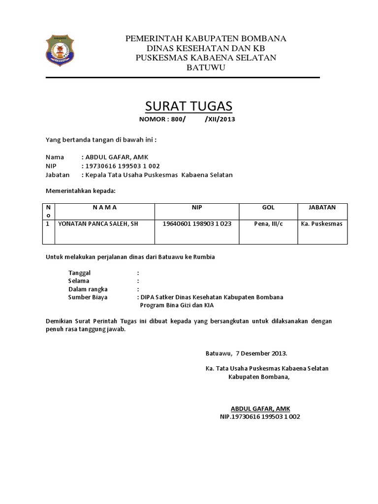 Doc Contoh Surat Tugas Satker Dinkessosswl Academia Edu